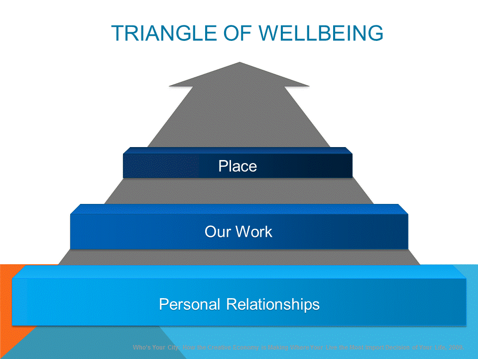 In his captivating best-seller Stumbling on Happiness, Harvard psychologist Daniel Gilbert writes that “most of us make at least three important decisions in our lives: where to live, what to do and with whom to do it.”But Gilbert’s book mostly focuses on the “what” and the “who.”That happiness researchers like Gilbert mainly ignored the “where” inspired Richard Florida’s partnering with Gallup to conduct a major US study that shows the overwhelming importance of place to happiness. (There is also a related European version conducted by Robert Manchin of Gallup Europe.)The research confirms that “Place” forms the third leg in the triangle of wellbeing, alongside of personal relationships and our work.